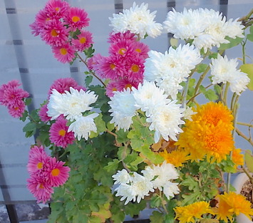 白菊が開花中!「サニーレタス」育苗!「ほうれん草」の種蒔き!「ニラ」の収穫!