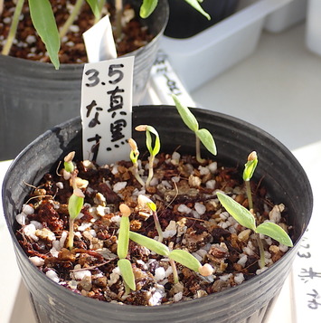 追加まきの「真黒茄子」が発芽して来た!「春菊」「水菜」の植え替え!「千筋京水菜」の収穫!