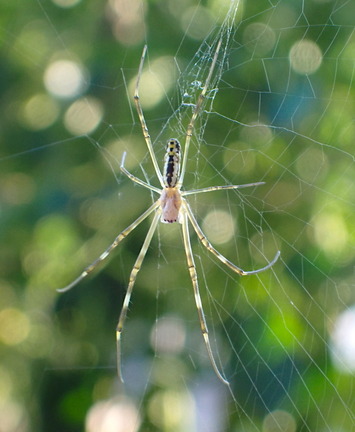 「アシナガグモ」?? 強烈太陽光から逃げて軒下に移動した プランター栽培の「スイートパレルモ」のところに いつも蜘蛛の巣を張っています きれいな···