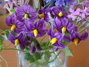 ジャガイモの花をテーブルに飾っています グランドペチカの花がとてもきれいなんです テーブルに飾っています 夜間は閉じていますが 朝明るくなって···