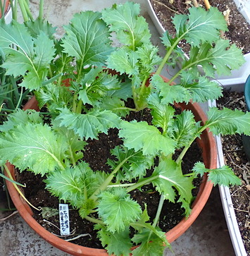 「広巾晩生白茎京菜」! 今年も浅漬けで楽しもうと思って 栽培しています 寒さに強くて大株に育ちます これでは鉢が小さいですね 後日 一株ずつに···