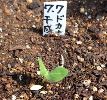 「ドカナリ千成」が発芽しました! 6月初めに種子を買っていくつか種蒔きして 発芽後に育苗しましたが 全滅してしまって 2粒だけ残っていたタネを直···