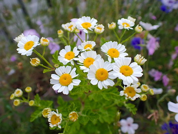 「フィーバーフュー」の花が開花! 大好きな花で以前よく栽培していました 昨秋に種蒔きしてあったので背丈が伸びて来て 今 やっと咲いてくれました···