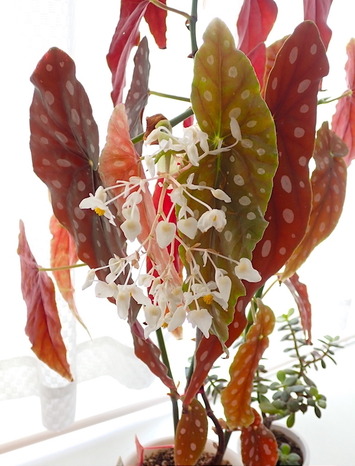 出窓棚の「木立ベゴニア」開花中! 息子の結婚式パーティーのテーブルに 飾られていたベゴニアを頂いて来て 挿木して育てています 今年もきれいに白い···