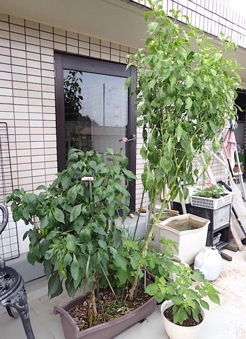 「スイートパレルモ」赤と黄!! 普通の横長のプランターで赤と黄が実るはずの 2本を栽培中ですが 手前の背が低い方が黄色で奥の倍以上に大きい 背丈···