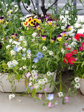 バルコニー菜園の花たち!! MIXの種子を昨秋蒔いたらいろいろ開花して にぎやかになりました ニゲラ バージニアストック アリッサム パンジー ビ···
